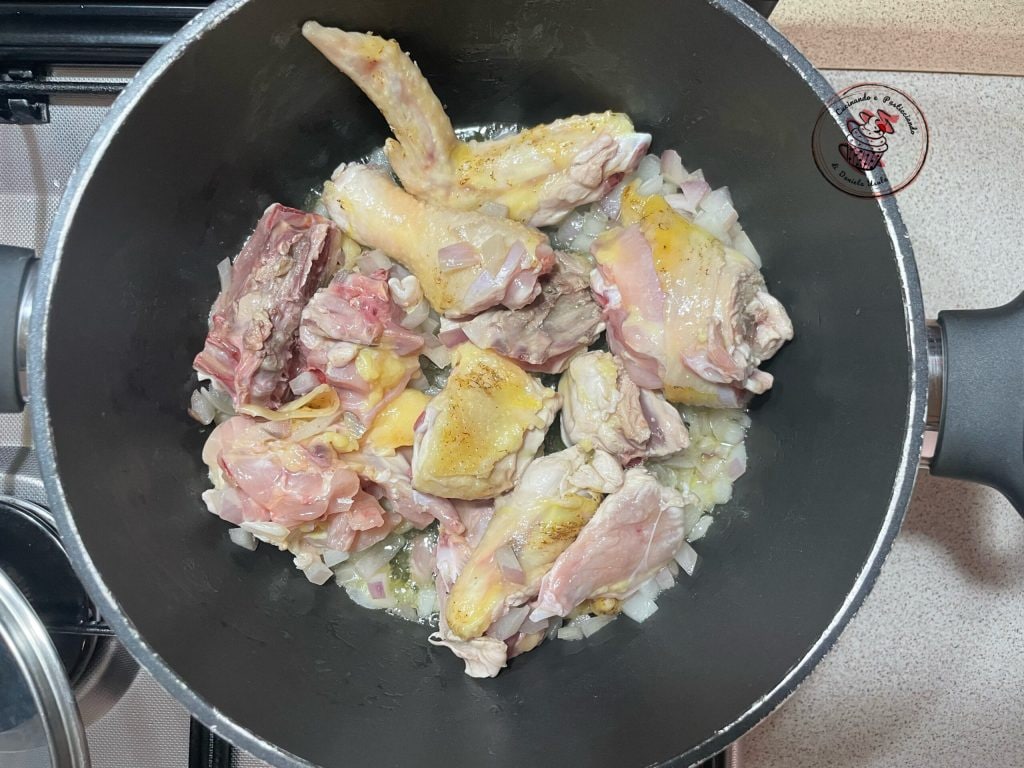 Snijd de kip in stukjes en bak het met de gesneden ui en olijfolie.