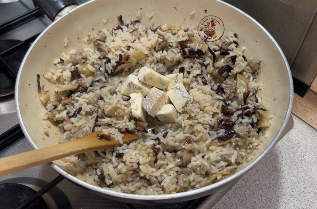 De risotto met worst, radicchio en gorgonzola is een van die gerechten die je hart en maag verwarmen. Een rijk, omhullend hoofdgerecht, met de bittere noot van radicchio die perfect samengaat met de hartigheid van de worst en de romigheid van de gorgonzola.