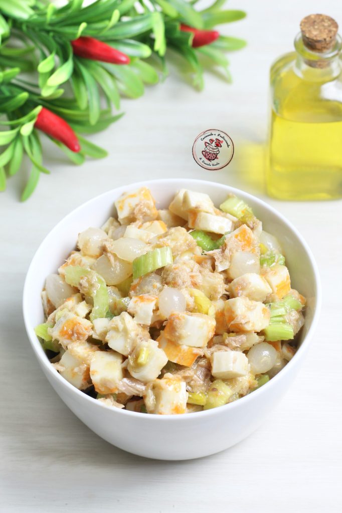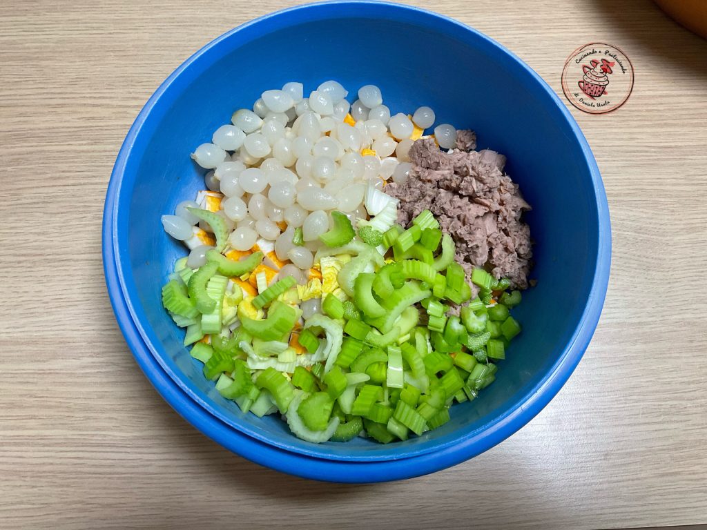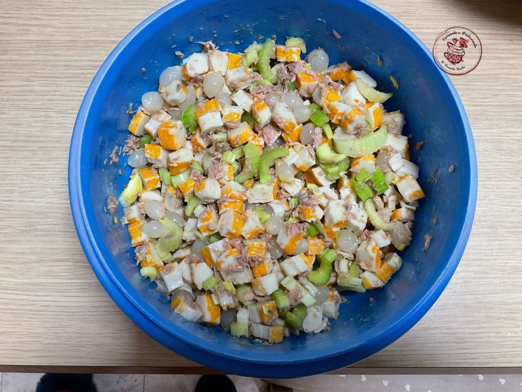 Was de selderij en snijd deze in vrij kleine stukjes en voeg toe aan de surimi samen met de uitgelekte zilveruitjes en tonijn.