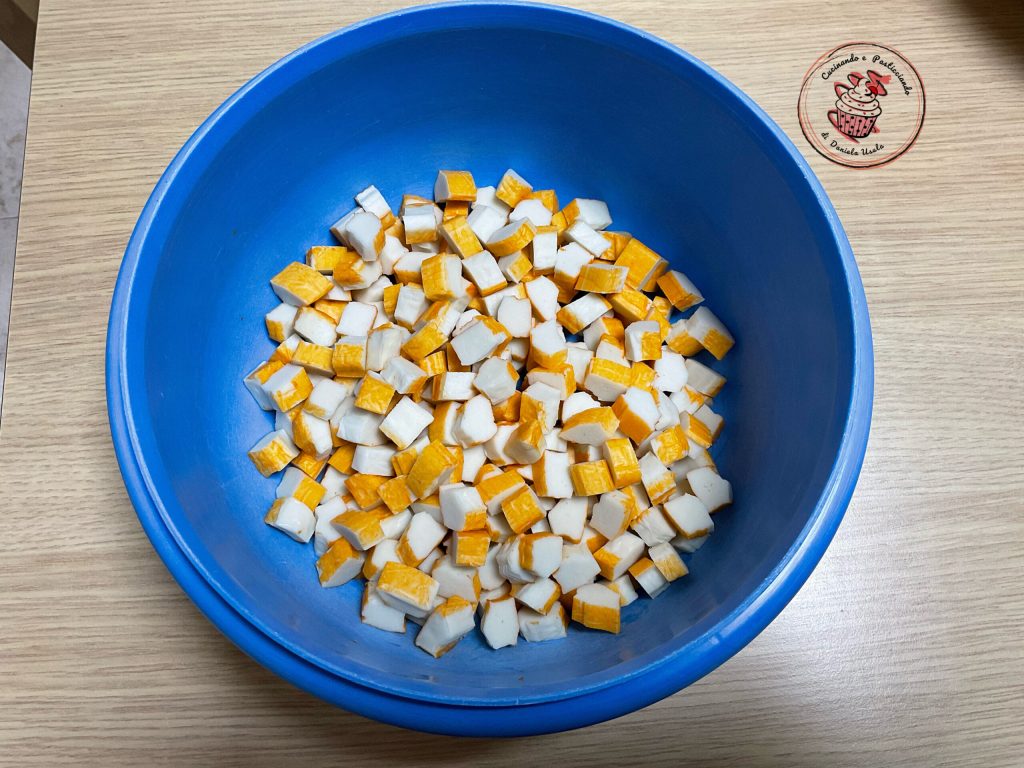Laat de surimi ontdooien zodat ze gemakkelijk te snijden zijn. Snijd ze in stukjes in een kom.