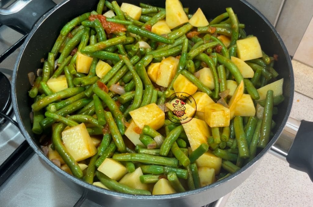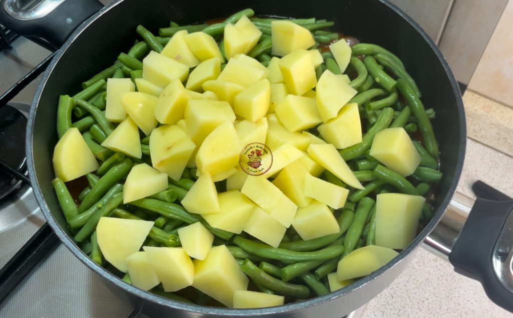 Was 1 kg sperziebonen, snijd de uiteinden en voeg ze toe aan de tomaat. Schil de aardappelen en snijd ze in stukken en voeg ze toe aan de sperziebonen. Als de sperziebonen erg lang zijn, snijd ze dan doormidden.