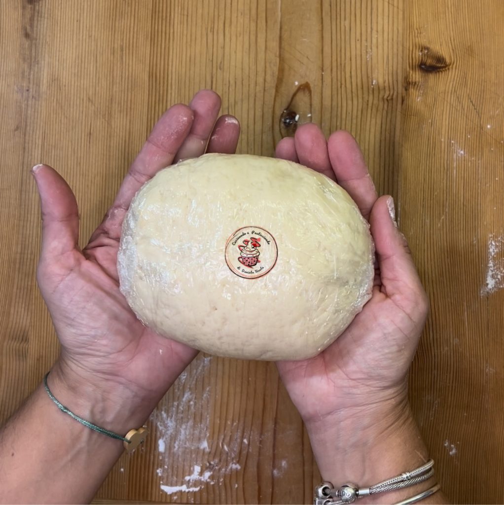 Breng over naar het werkblad, vorm het deeg met de handen en wikkel het in plasticfolie. Laat het deeg 30 minuten in de koelkast rusten voordat je het gebruikt.