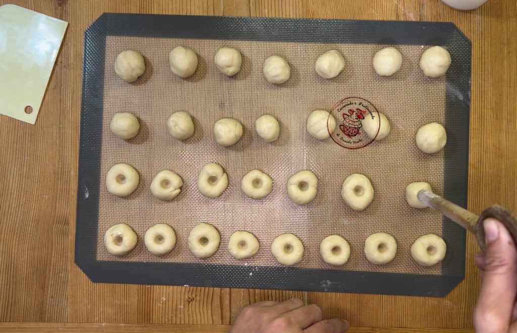 Plaats de balletjes op de bakmat (als je die niet hebt, is een bakplaat bekleed met bakpapier ook prima). Maak met de punt van een met bloem bestoven lepel een gat in het midden.