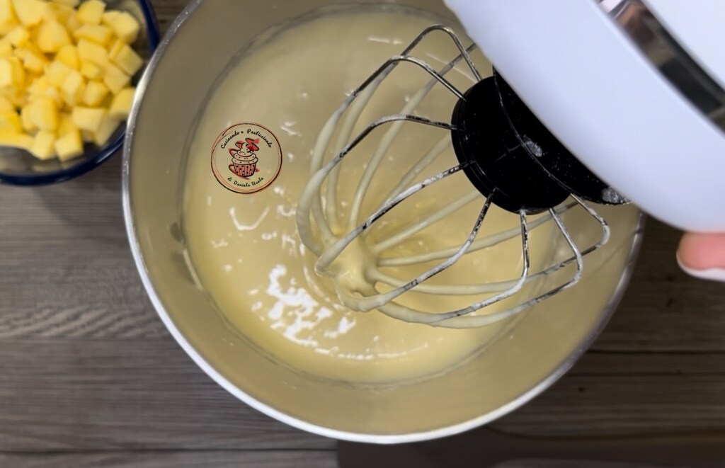 Voeg op dit punt 2 gewassen, geschilde en in blokjes gesneden appels toe aan het beslag en meng met de spatel.