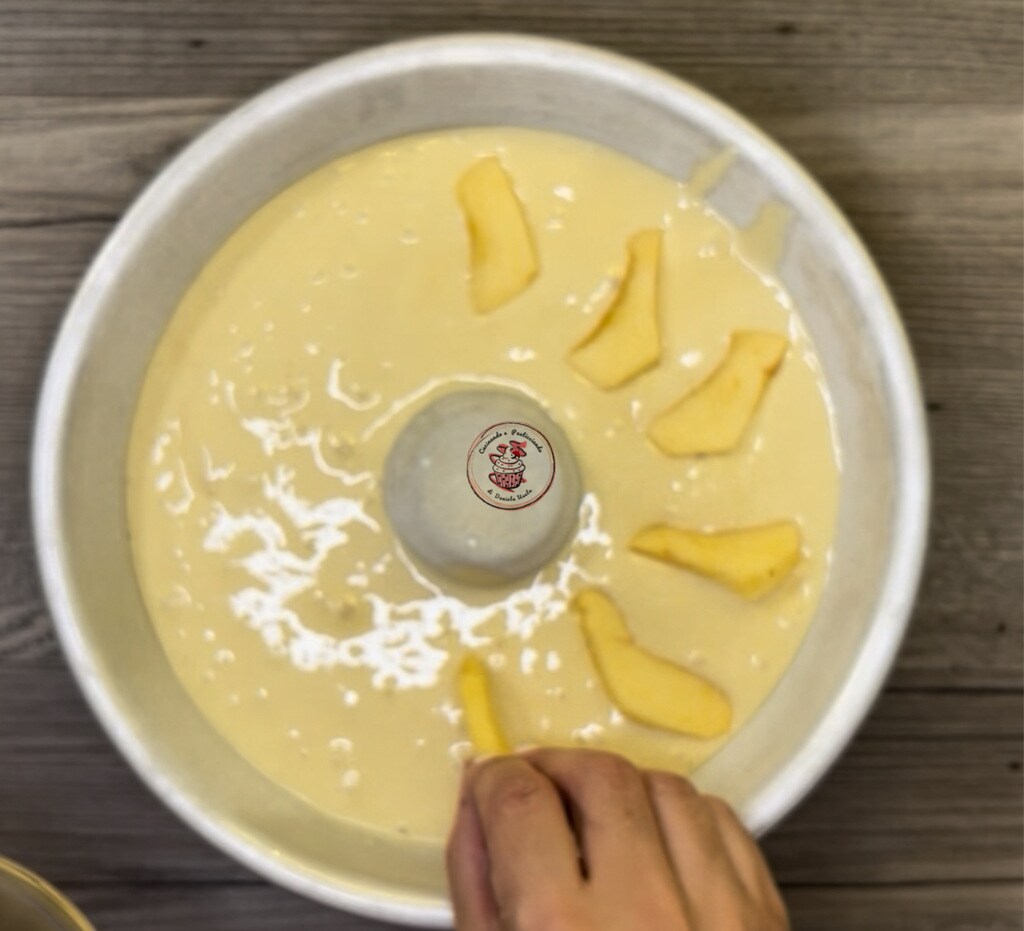 Giet het mengsel in een ingevette en met bloem bestoven cakevorm en voeg de resterende 2 gewassen, geschilde en in plakjes gesneden appels toe aan het oppervlak. Bak ongeveer 40 minuten op 180º.