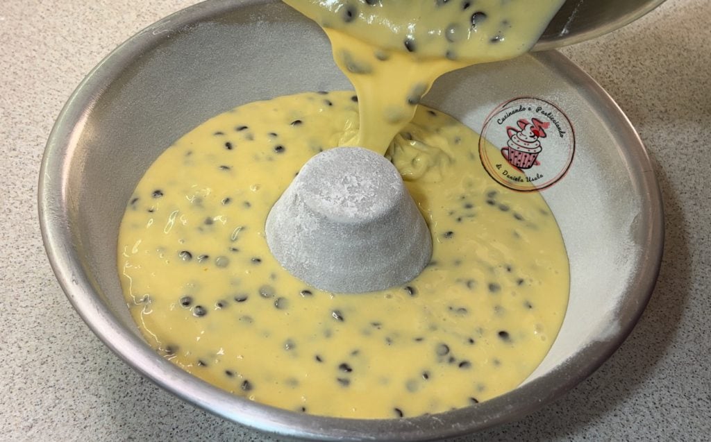• Giet het mengsel in de vorm, van 24 cm in diameter, ingevet en bebloemd, en bak ongeveer 40 minuten in een voorverwarmde oven op 180°C. Doe de satéprikker-test voordat je het eruit haalt, want niet alle ovens zijn hetzelfde.