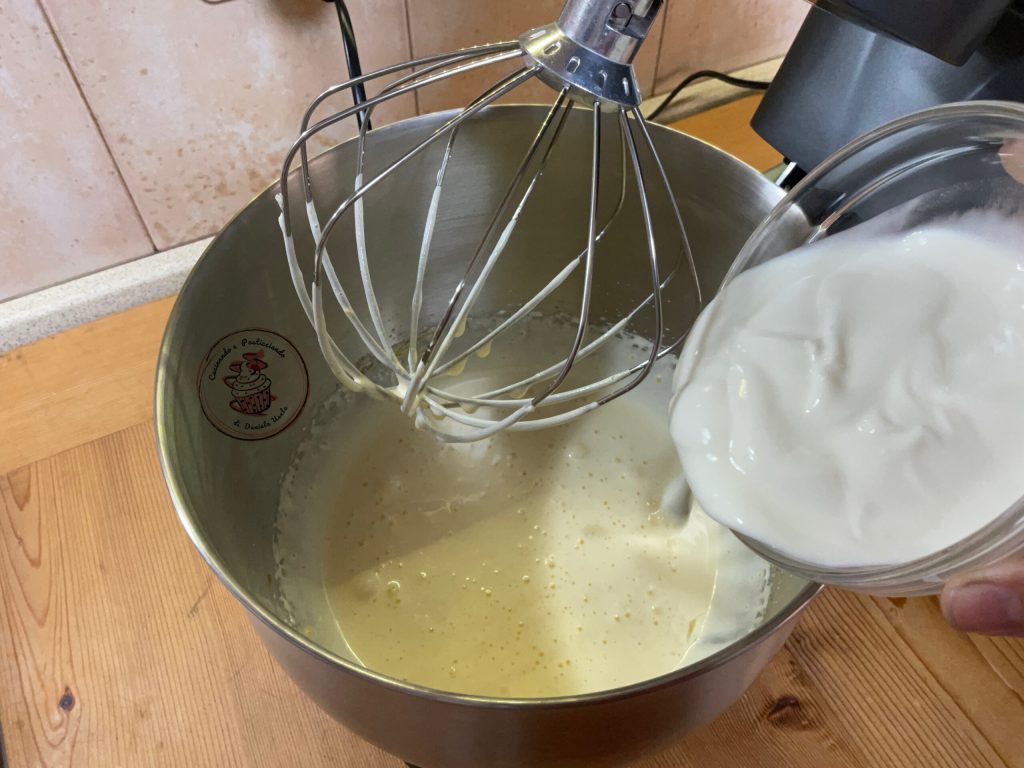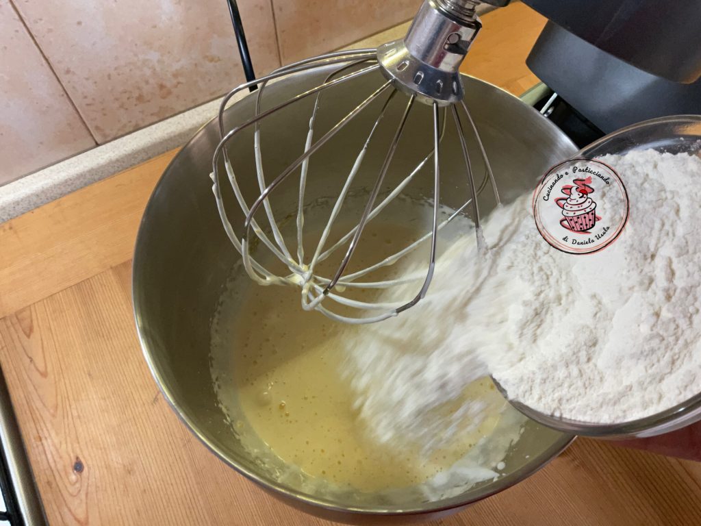 Klop de suiker met de eieren in de keukenmachine gedurende ongeveer 10 minuten, ze moeten luchtig en schuimig zijn.