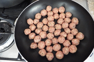 Verhit een beetje extra vergine olijfolie in de antiaanbakpan. Voeg de gehaktballetjes toe en laat ze aan alle kanten bruin worden bij matig vuur door de pan te bewegen zonder een lepel te gebruiken om ze te draaien