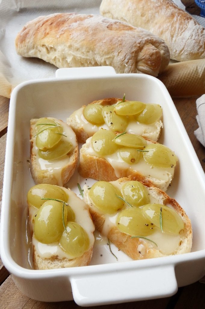De crostini met druiven en taleggio zijn een voorgerecht met een herfstachtige smaak, zeer snel te bereiden, je hebt slechts een paar minuten nodig, en de smaak is echt geweldig, mogelijk gemaakt door de combinatie van druiven en taleggio, twee ingrediënten die samen een unieke explosie van smaken creëren.