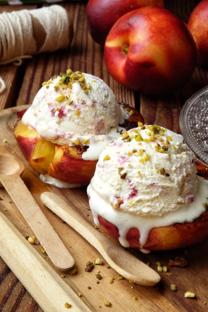 De gegrilde perziken met ijs zijn een zeer snel te bereiden zomerdessert, perfect om na het avondeten te serveren tijdens de warme zomeravonden.