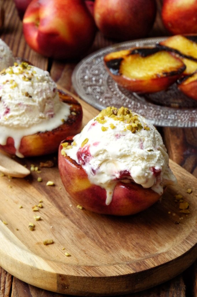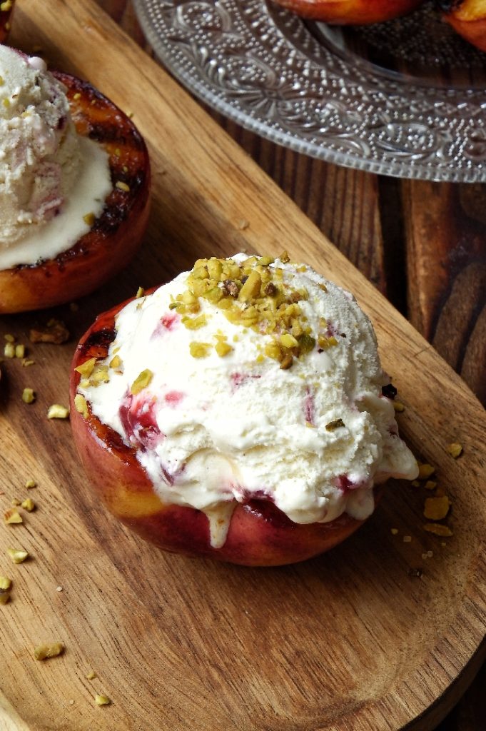 Leg de gegrilde perziken op een serveerschaal en bestrooi direct met wat bruine suiker. Versier tenslotte met ijs en pistachenoten. Smakelijk eten! Je vindt het videorecept op mijn Instagram-profiel HIER.