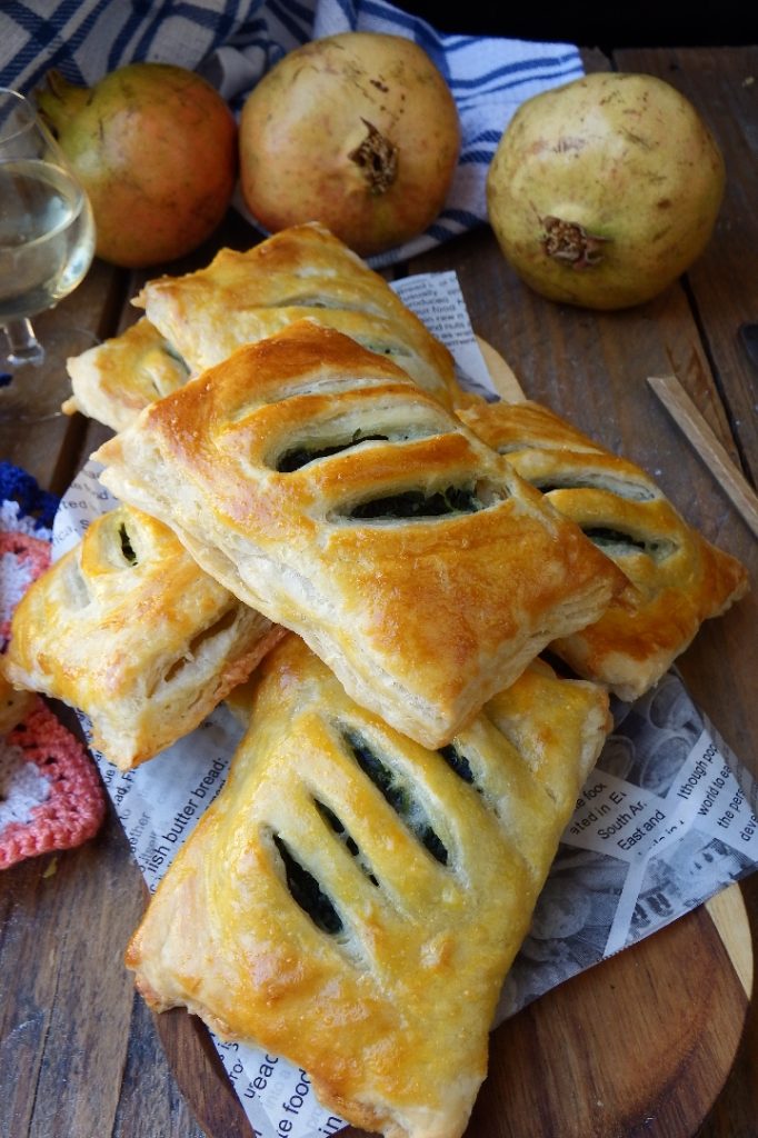 De gevulde pakketjes met spinazie zijn een zeer smakelijk voorgerecht, bereid met zelfgemaakt bladerdeeg en vervolgens gevuld met spinazie en Parmezaan.