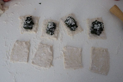 Leg in het midden van 12 rechthoeken de spinazie en bestrooi met een royale hoeveelheid geraspte Parmezaan