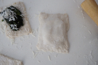 Bedek het gevulde rechthoek met een ander rechthoek van bladerdeeg, druk met de vingertoppen langs de randen
