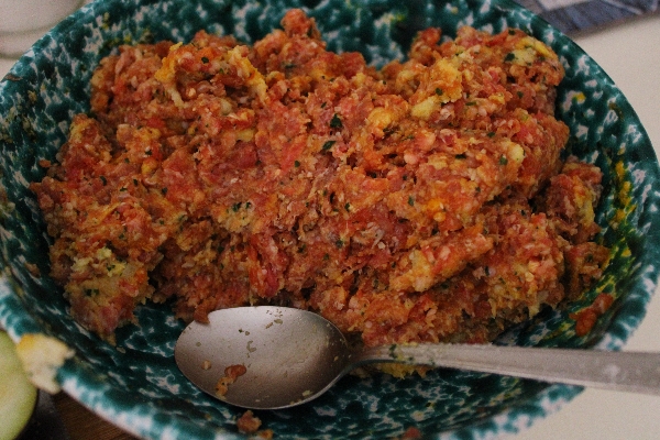 Doe het gehakt in een kom met de eieren, de geraspte Grana Padano, het in melk geweekte en goed uitgeknepen brood, de gehakte knoflook, peterselie en het vruchtvlees van de groenten. Breng op smaak met zout en peper, kneed goed met je handen tot het mengsel zacht maar stevig is