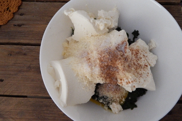 Doe in de kom de gezeefde koeienricotta met de parmezaan, de nootmuskaat, het ei en de spinazie