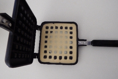 • Giet er een beetje beslag in. Sluit het wafelijzer, plaats het op het vuur en bak twee minuten per kant op middelhoog vuur.
