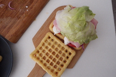 • Leg ten slotte de blaadjes ijssla erop, bedek met de andere wafel als een echte sandwich en smakelijk eten! Je kunt het videorecept vinden HIER op mijn Tik Tok @isaporidicasa