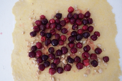 • Verwijder de pit uit de kersen en zet apart. Rol het deeg uit op de werkbank waar je een met bloem bestoven bakpapier hebt gelegd