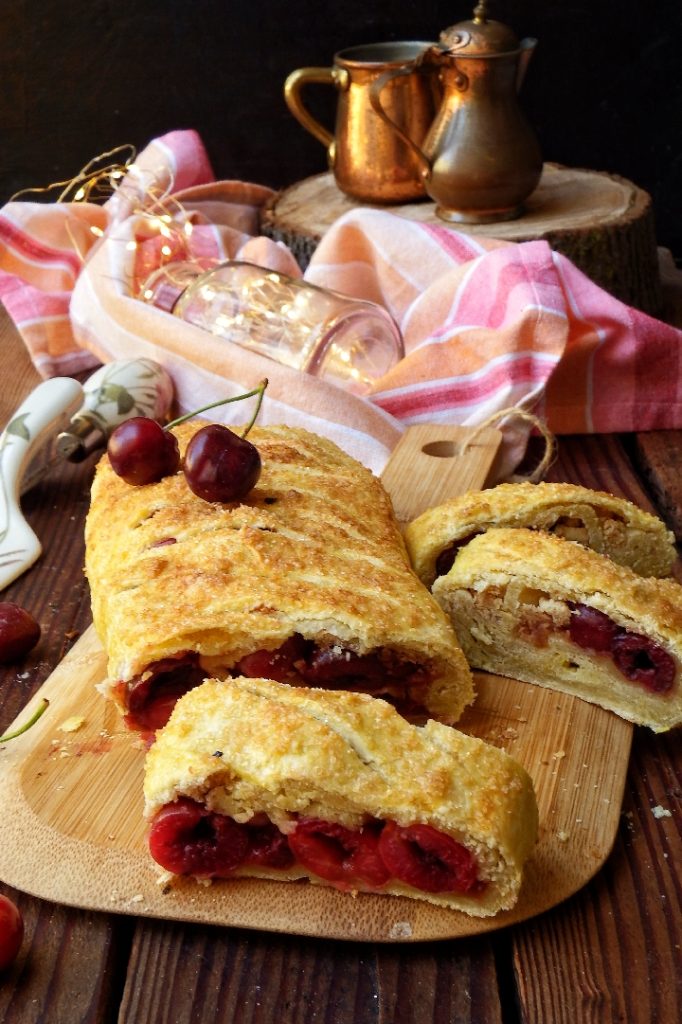De kersenstrudel is een heerlijke rustieke zomerdessert, met een knapperige korst die een rijke vulling bevat op basis van kersen en koekjes.