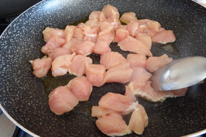 Giet een scheutje extra vergine olijfolie in een grote koekenpan, verwarm en voeg de kipstukjes toe en bak ze aan beide kanten bruin.