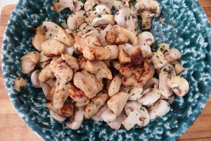 Voeg de inmiddels afgekoelde kipstukjes toe aan de kom met de kip