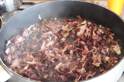 • Reinig de rode radicchio en snijd in julienne. Doe in de koekenpan met de gehakte ui en een scheutje olie.