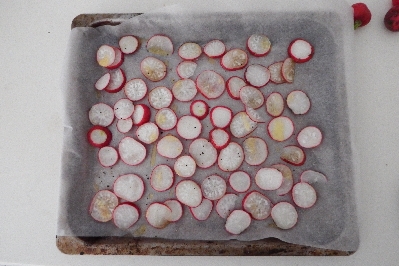 • Leg de radijsschijfjes op de bakplaat bedekt met bakpapier, zonder ze te overlappen