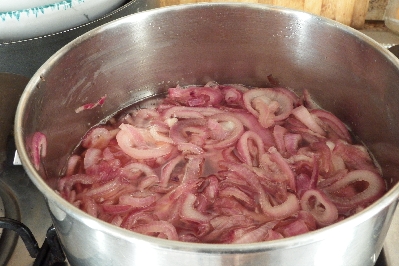 Verwijder het kaneelstokje en giet de uien met de maceratievloeistof in de pan en kook op laag vuur gedurende ongeveer 40 minuten