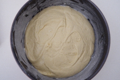 Beboter en bebloem een vorm met een diameter van 20 centimeter. Giet de helft van het beslag erin en strijk glad met een spatel