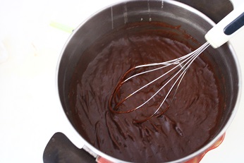• Hak de pure chocolade en zet apart. Klop in een pan van het vuur de eierdooiers met de suiker tot ze licht en schuimig zijn, voeg dan het maïszetmeel toe en blijf kloppen.
