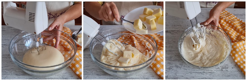• Doe de inmiddels koude room in een grote kom en klop het kort met een elektrische mixer. Voeg in 2 of 3 keer de zachte boter toe en blijf kloppen met de mixer.