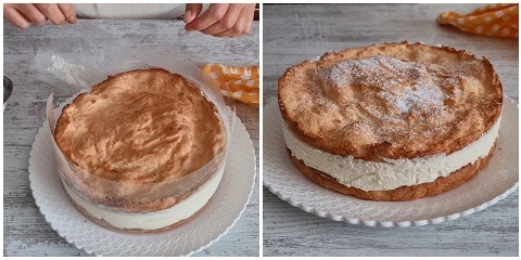 Giet de room op de basis en egaliseer met de achterkant van een lepel, dek af met de andere schijf soesjesdeeg en druk het goed aan met je handen. Dek af en plaats de taart minimaal 4 uur of langer in de koelkast (ik heb het de dag ervoor gemaakt en ongeveer 12 uur in de koelkast laten staan).
