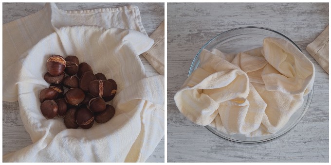 Bekleed een kom met een schone theedoek en stort de gare kastanjes erin, dek af met de randen van de doek en laat 5 minuten rusten. Zo worden de kastanjes zacht en makkelijk te pellen.
