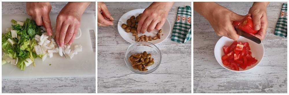 Ik heb een grote hoeveelheid caponata gemaakt (voor ongeveer 8 personen), omdat ik gasten had en ook omdat, als er wat overblijft, ik het 2 – 3 dagen in de koelkast kan bewaren. Als je minder nodig hebt, halveer dan de hoeveelheden.