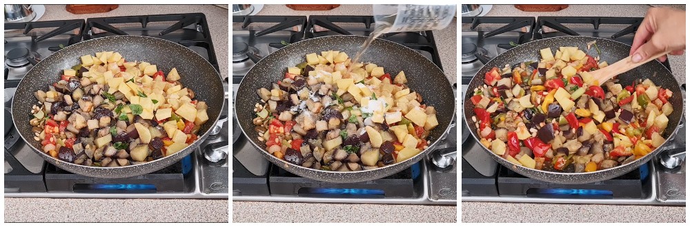 Voeg op dit punt de gefrituurde groenten toe aan de pan (paprika’s, aubergines en aardappelen); voeg zout toe, enkele basilicumblaadjes, de suiker en ten slotte de azijn.