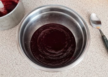Ondertussen doe je de moerbeien in een vergiet en was ze voorzichtig onder stromend water, laat ze goed uitlekken. Doe ze in een kom en pureer ze tot een gladde massa.