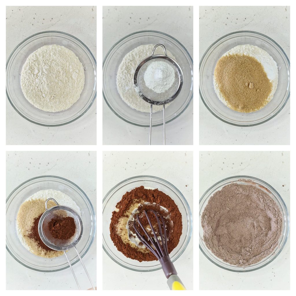 Begin met het verzamelen van de bloem, het gezeefde bakpoeder, de suiker en het ongezoete cacaopoeder in een kom. Meng alle poeders goed met een handklopper.