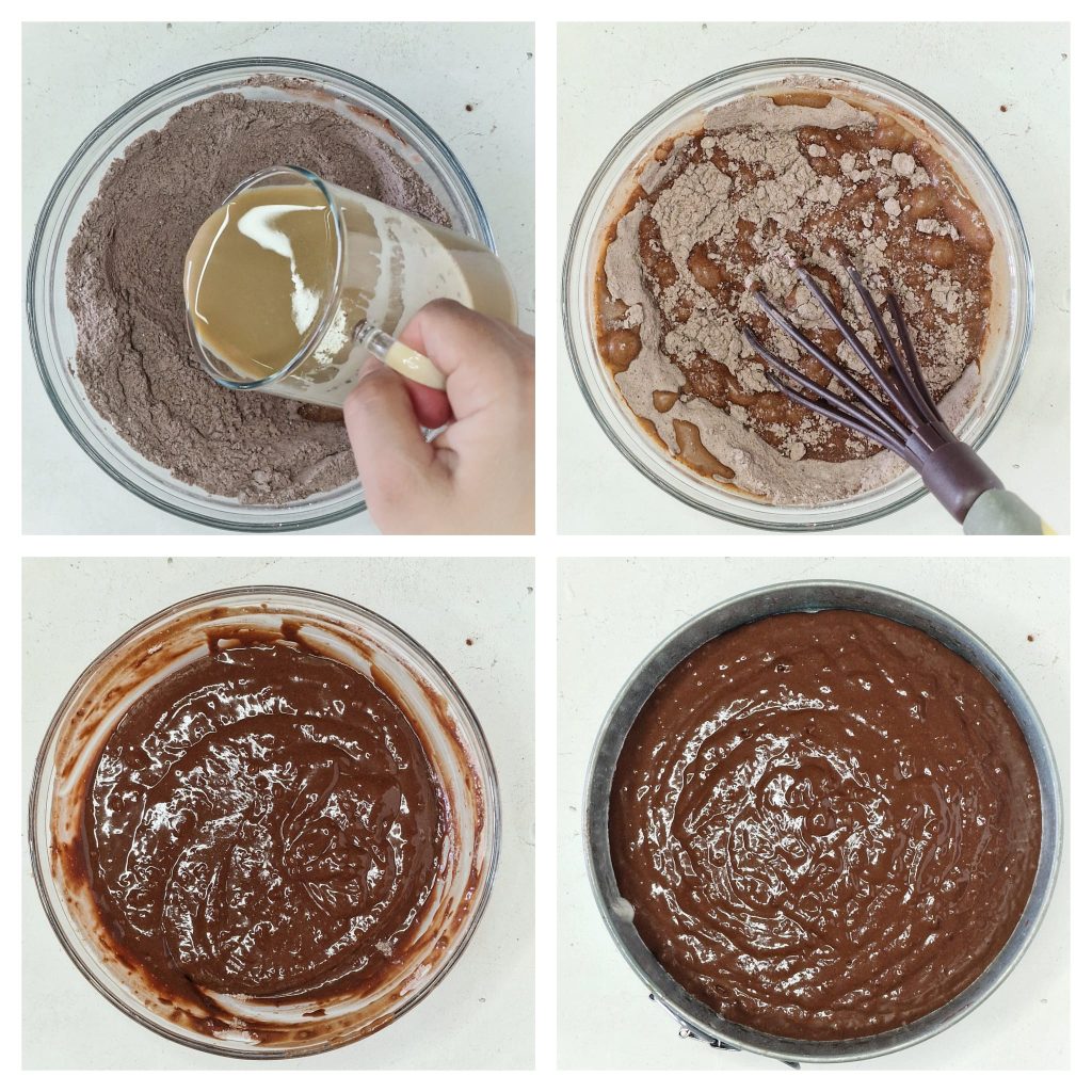 Voeg op dit punt het mengsel van melk en koffie toe en meng opnieuw tot je een homogeen mengsel krijgt. Giet het beslag in een voorheen ingevette en met bloem bestoven springvorm en bak de taart in een voorverwarmde statische oven op 180°C gedurende 25-30 minuten.