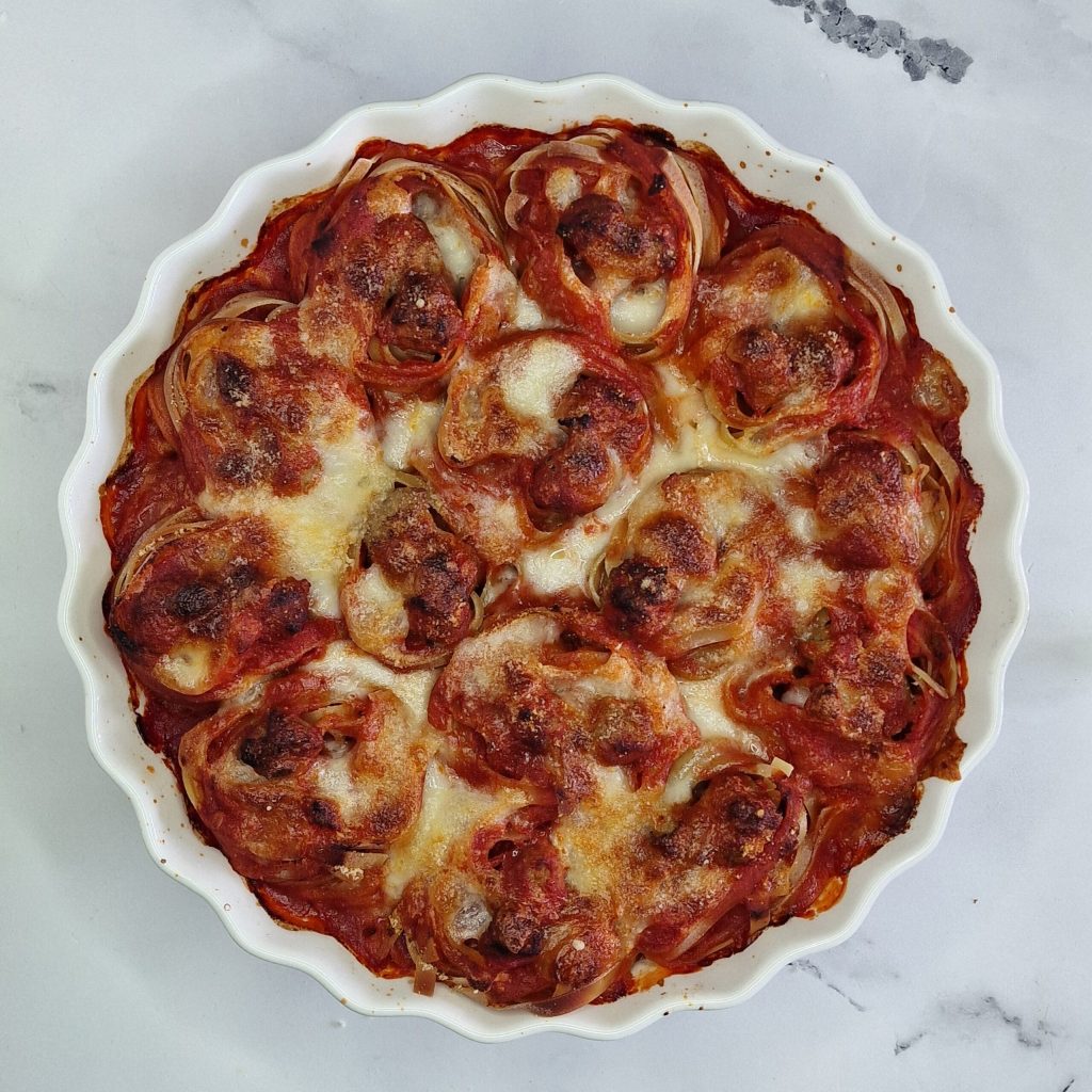 • Zodra de tomatensaus klaar is, giet je een paar lepels ervan in de ovenschaal zodat de bodem volledig bedekt is. Plaats op dit punt de tagliatellenesten in de schaal en leg in het midden van elk nest minstens een paar worstballetjes.