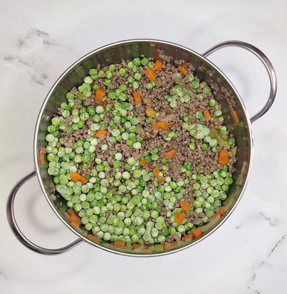 Als het alcoholische deel van de wijn is verdampt, voeg je de erwten toe.