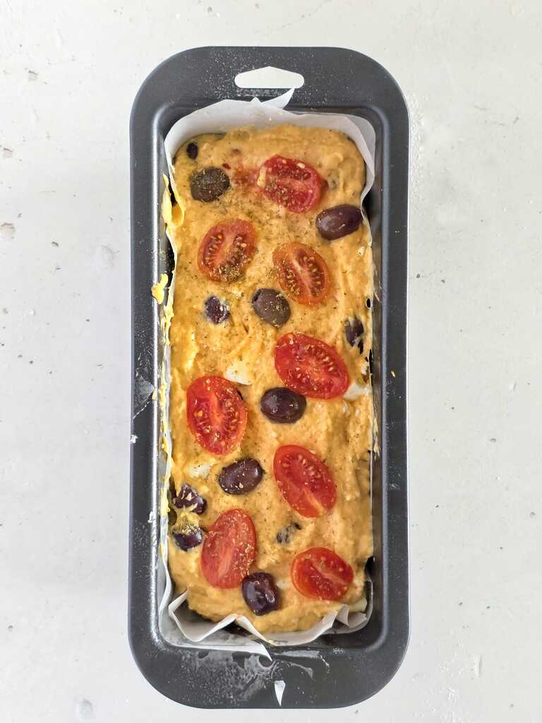Voor het bakken, verdeel wat verse gehalveerde kerstomaatjes, enkele olijven en een snufje gedroogde oregano over het oppervlak van de tomatenplumcake.