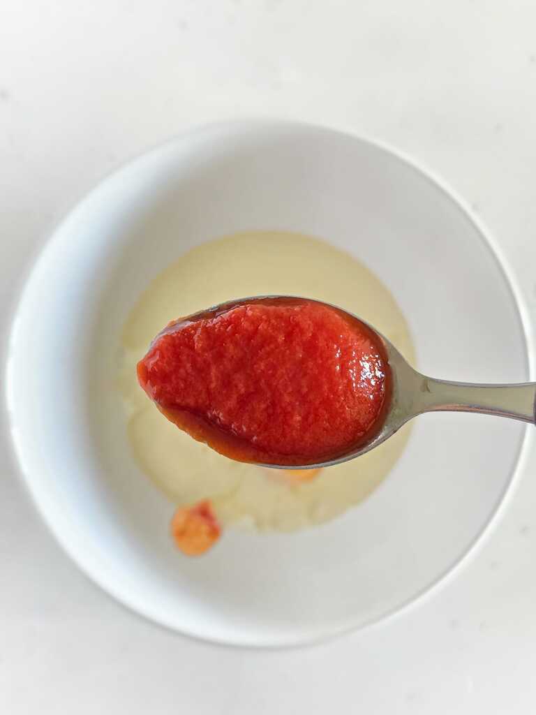Ga verder met het toevoegen van de tomatenpuree, zout en voeg dan de gezeefde bloem toe.