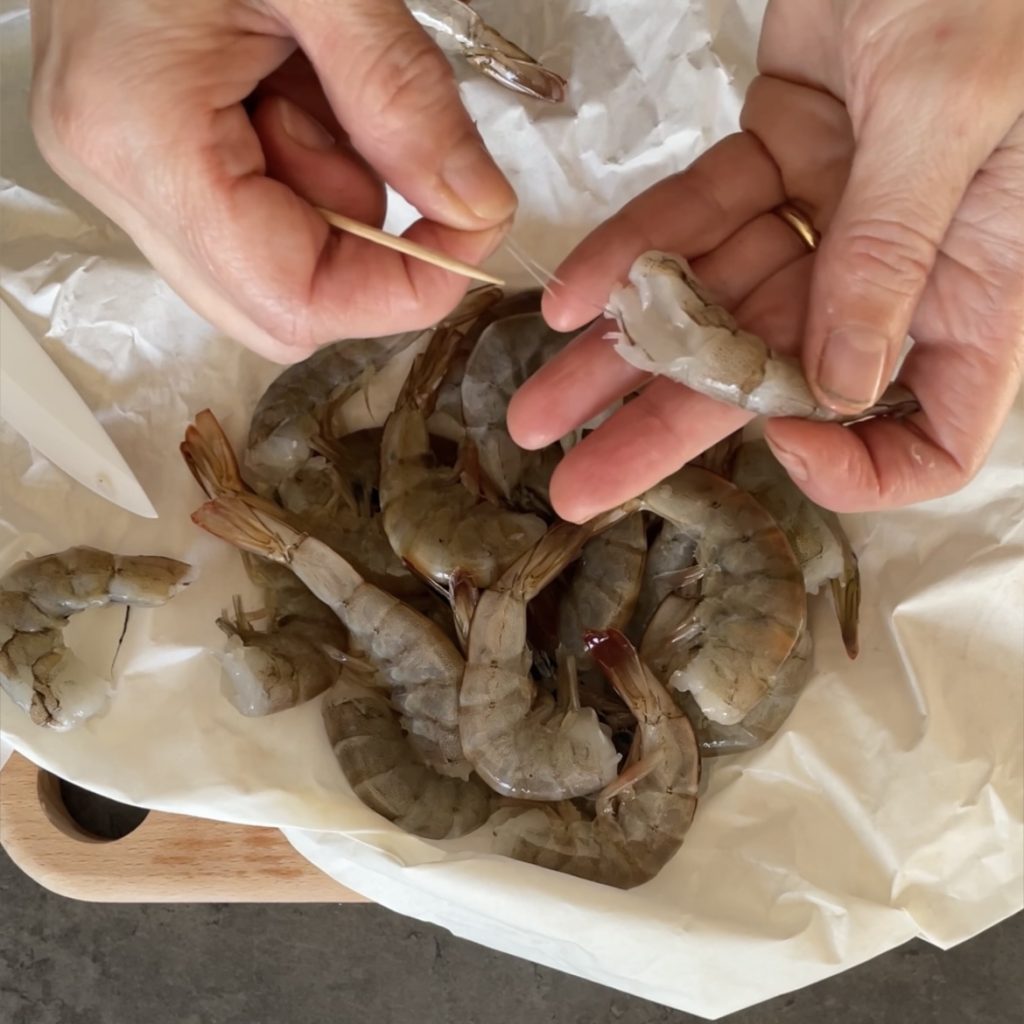 Begin met het bereiden van de Aardappel- en garnaalsalade, verwijder de schalen van de garnalen, snijd de rug open en verwijder met een tandenstoker het zwarte draadje en was de garnalen onder stromend water.