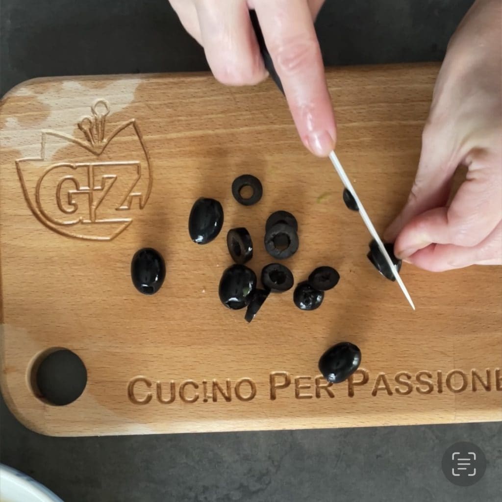 Snijd ook de olijven in ringen en voeg ze toe aan de groenten.