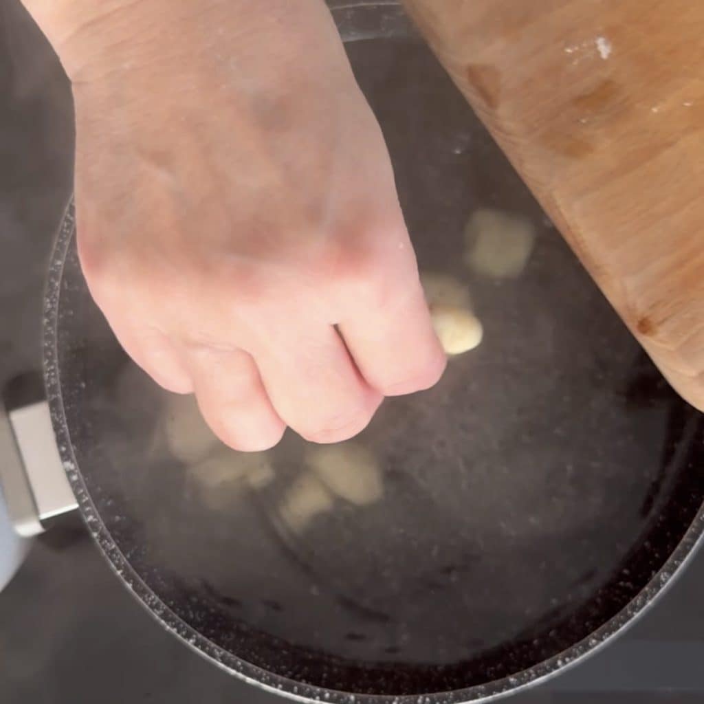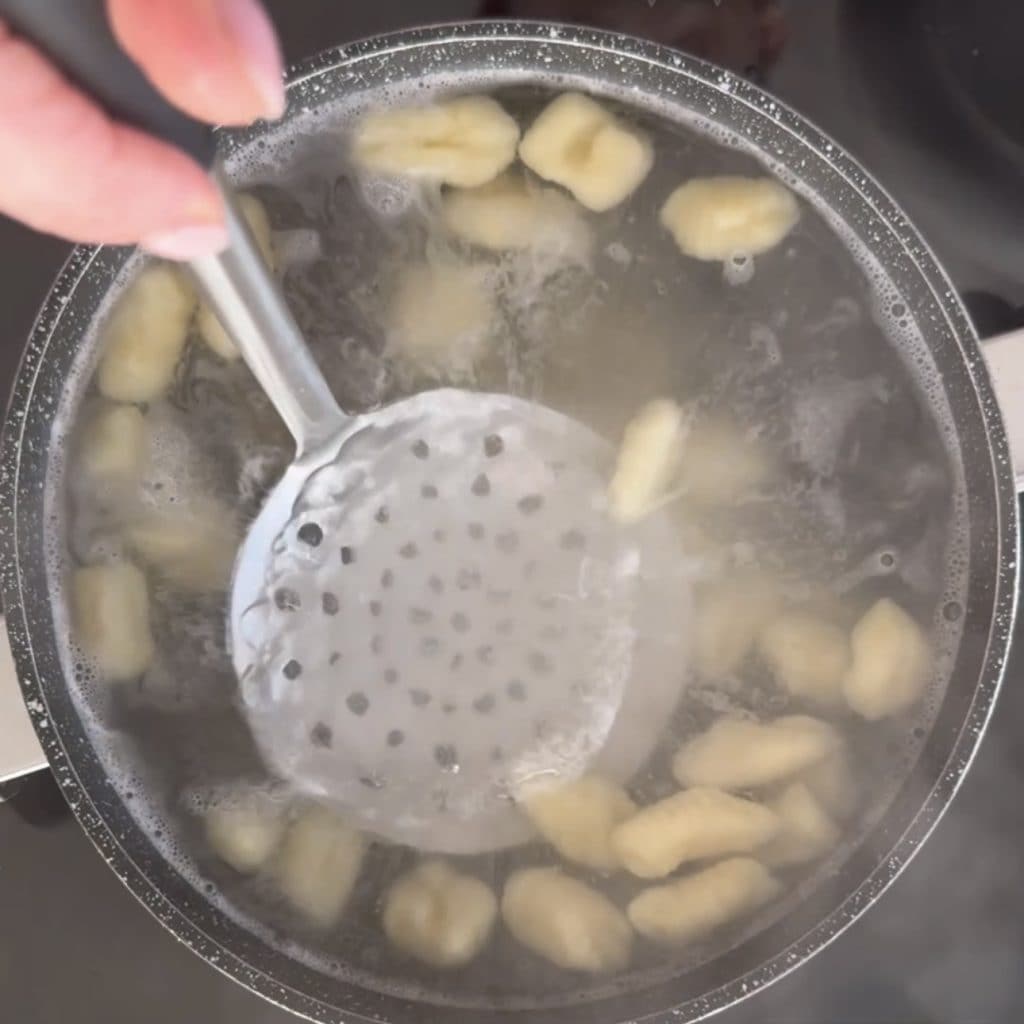 • Breng water aan de kook, zout het en voeg de Aardappelgnocchi zonder eieren beetje bij beetje toe,