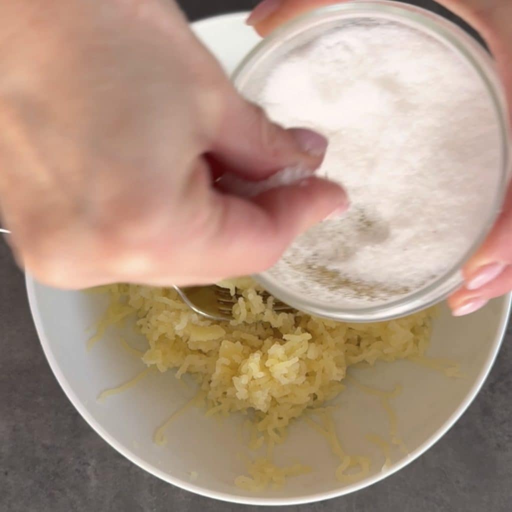 • Laten we beginnen met het bereiden van de Aardappelgnocchi zonder eieren, kook de aardappelen met de schil, of schil ze en snijd ze in parten en kook ze vervolgens op stoom, of bak ze in de oven in folie, ik kook ze meestal op stoom in een snelkookpan. Plet de aardappelen met behulp van een aardappelstamper en doe ze in een kom, laat ze afkoelen maar niet helemaal afkoelen.