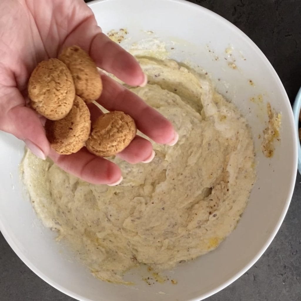 en breek de amaretti grof.