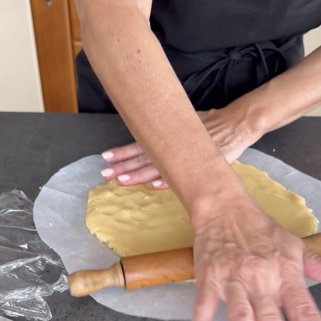Na de rusttijd in de koelkast haal je het zanddeeg eruit en neem je 2/3 van het zanddeeg,