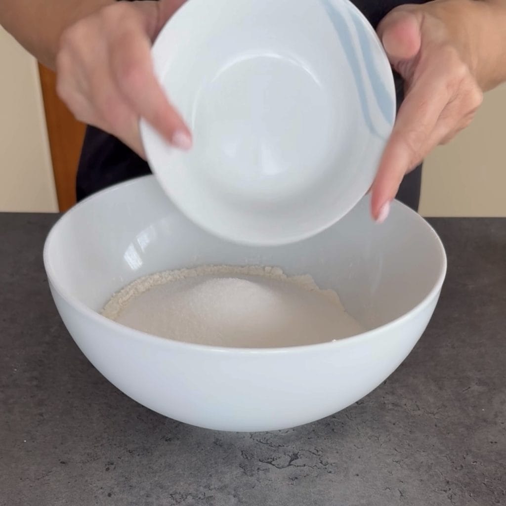 We beginnen met het maken van de Amandeltaart, eerst maken we het zanddeeg, je kunt een keukenrobot, een blender of met de hand kneden gebruiken. Doe de bloem en de suiker in de kom,